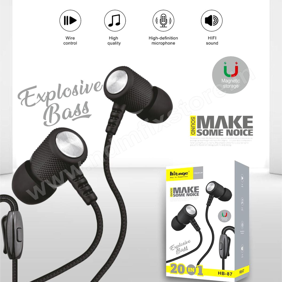 The Hitage HB-87 earphones are premium wired earbuds with explosive bass and a “Make Some Noise” sound profile, delivering a smart, super‑bass audio experience. They come with magnetic earphone storage for tangle‑free handling and an ergonomic design that prevents ear fatigue during long use. Marketed under the slogan “Way to Happiness”, they’re positioned as a stylish, affordable accessory for immersive music enjoyment. The Hitage HB-87 earphones work with any device that has a 3.5 mm audio jack (most smartphones, laptops, tablets, MP3 players).