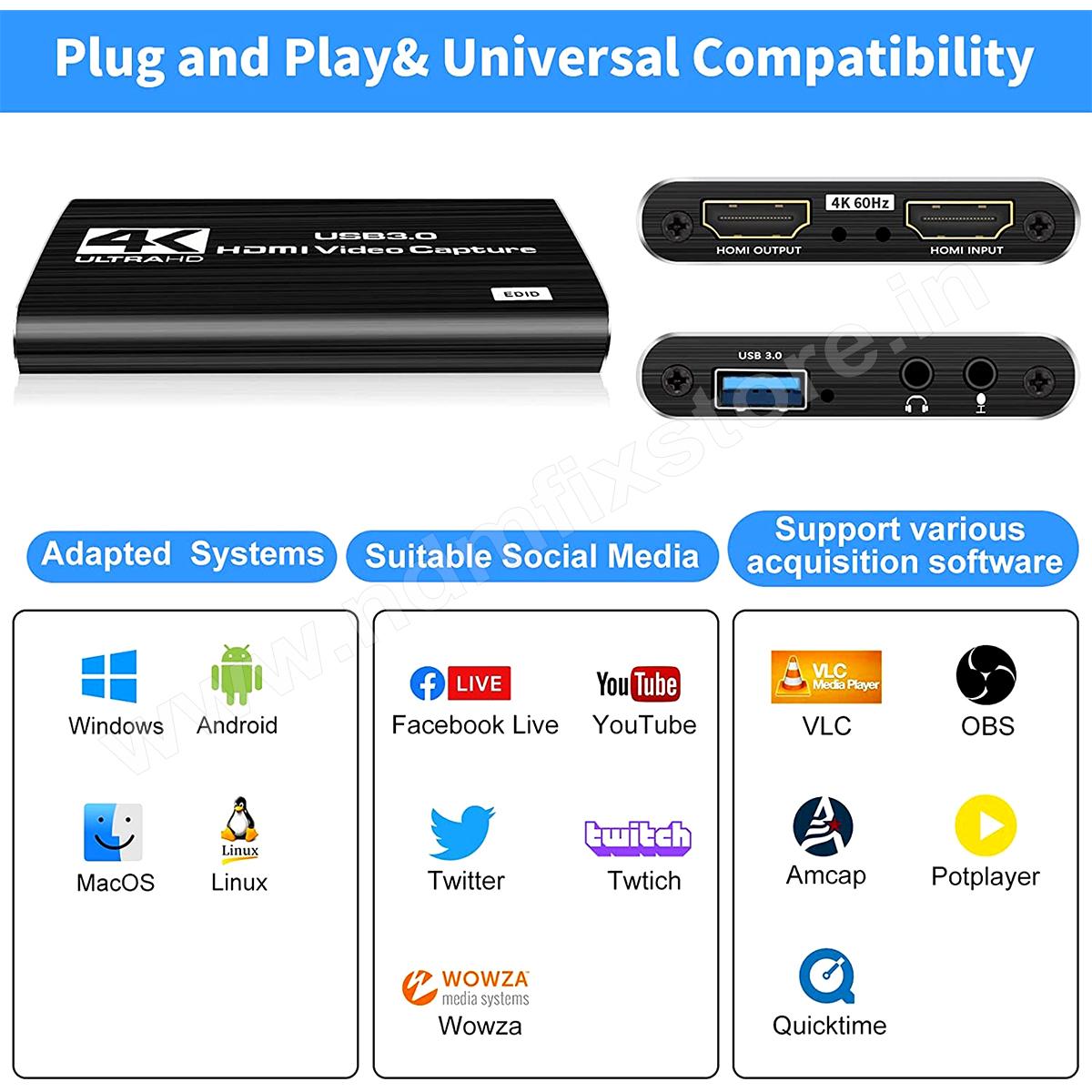 Microware USB 3.0 Capture Card generates a high-quality HD 4K 60fps video effect. It shows well and very compatible with live streaming or recording, like platform YouTube, Twitch, Facebook, etc.